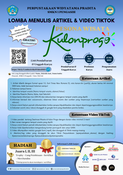 Perpustakaan Widyatama Pradita mengawali bulan April 2023 ini dengan menyelenggarakan Lomba Menulis Artikel dan Video Tiktok untuk siswa-siswi SMA/SMK/MA se-Kulon Progo. Lomba untuk siswa ini sebagai pendukung Gerakan Literasi dan dilakukan sebagai agenda rutin tahunan. Lomba di tahun ini dilaksanakan dengan menjangkau lingkup yang lebih luas dibandingkan dengan lomba yang diselenggarakan tahun lalu. Lomba ini dilaksanakan dengan tujuan sebagai ajang unjuk bakat dan kreatifitas siswa dalam hal kepenulisan artikel dan foto/videografi sebagai output dari gerakan literasi yang sedang digalakkan di sekolah. Semakin populernya kawasan Kulon Progo menjadi destinasi wisata para wisatawan baik domestik maupun mancanegara menjadi alasan penyelenggaraan lomba ini. Di era serba digital ini, video kreatif menjadi media promosi terbaik untuk mempromosikan berbagai hal sehingga diharapkan dari lomba ini dapat mendukung promosi tempat wisata di Kulon Progo.